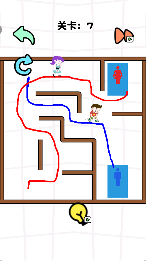 4、第六关也是比较的简单的,将两个人的路线完全分开就可以完成这个任务了。