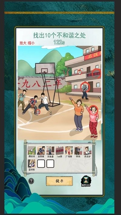 3、瞧怀旧篮球场景,从六个线索道具里选合适答案拖到空白框,或者点提示和加时按钮辅助闯关。