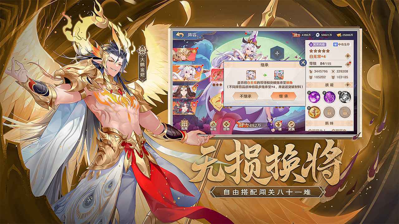 一键实现无损换将,神将到手即刻能用!在这里,你能够随时对自己的阵营与阵容进行更换。换将仅需一键操作,等级与装备自动继承,无需重新开始;所有养成皆支持重生,养成所消耗的资源将无损返还,助力你轻松培育心仪的阵容,灵活应对西行路上的挑战,在三界之中封神!