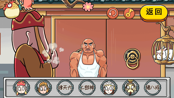 1、看游戏启动页,点中间橙色开始游戏按钮,旁边有金箍猴和古装人,右上角笼子里好像关着白动物。