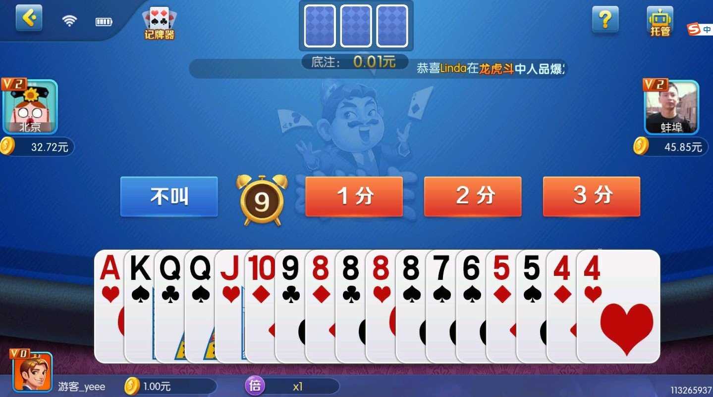 3.叫牌:游戏开始后,玩家可以选择是否叫地主。第一个叫地主的玩家自由叫分,其他两位玩家有权选择跟牌或者不跟。如果没有玩家叫地主,则重新发牌。